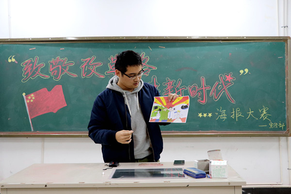 12月21日晚6:30,,,,,,,在图教楼B205室人文学院举行了以“致敬刷新路,,,,,,,奋进新时代”海报设计大赛,,,,,,,人文学院学生会主席刘轩、宣传部部长高洁、副部长谈星,,,,,,,第十四届宣传部部长金士清出席了本次大赛。。。。。。。
