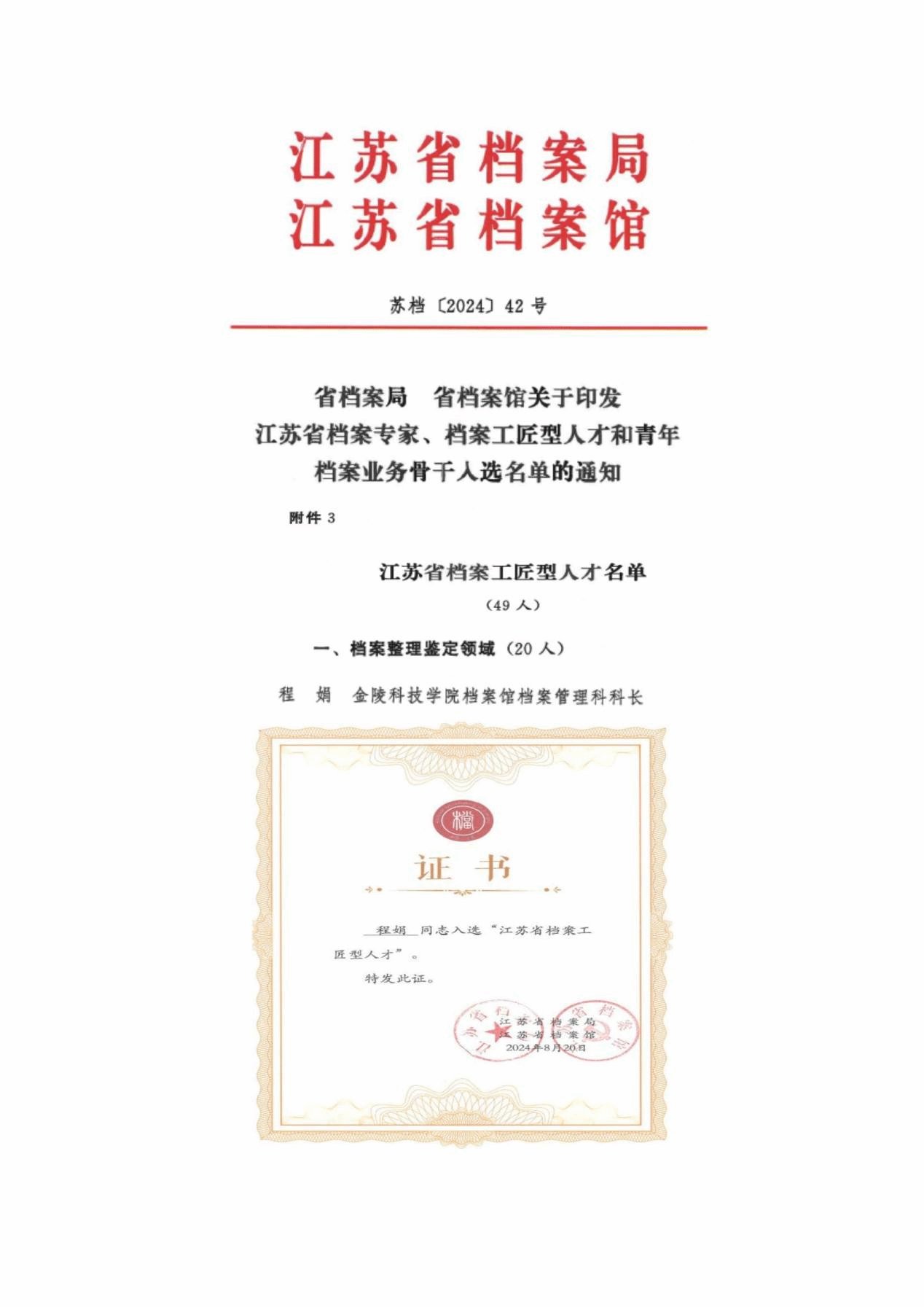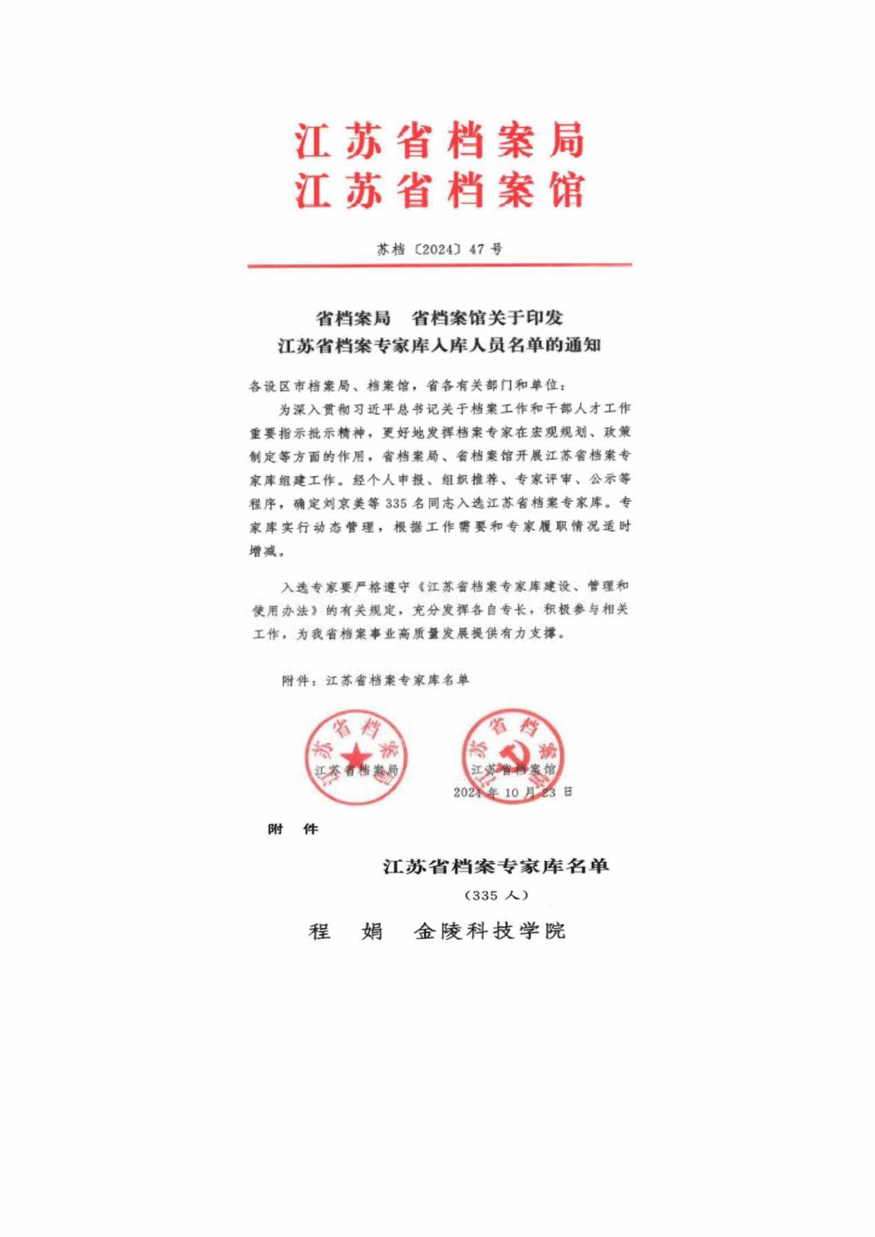 另据江苏省档案局、江苏省档案馆宣布的《关于印发江苏省档案专家库入库职员名单的通知》(苏档[2024]47号),,,,,,程娟先生也乐成入选江苏省档案专家库。。。。。此次江苏省档案专家库的组建,,,,,,经由小我私家申报、组织推荐、专家评审和公示等程序,,,,,,全省高校档案馆职员入选江苏省档案专家库成员共计63人。。。。。