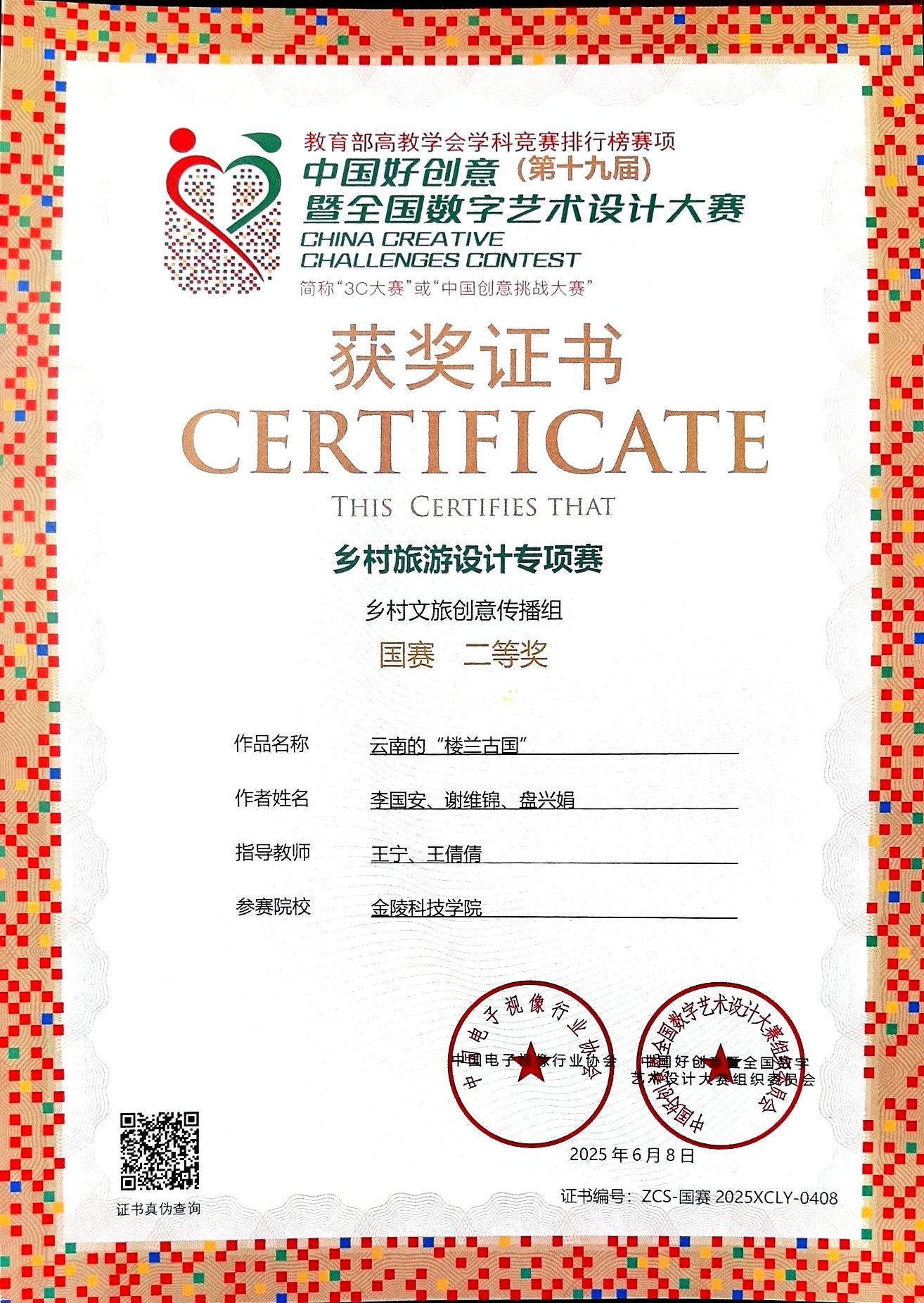 6月8日上午,,,,,第十九届中国好创意暨天下数字艺术设计大赛墟落旅游专项赛颁奖仪式在武汉商学院举行。。。。。。。经由大赛组委会的公正、公正、严酷的筛选评判,,,,,我校人文学院22数字出书(2)班李国安、盘兴娟、谢维锦三位同砚的作品《天空之镜下的梦幻墟落》和《云南的“楼兰古国”》获墟落旅游创意撒播组国赛二等奖。。。。。。。