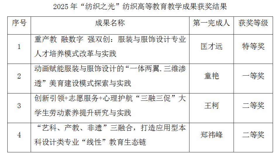 克日,,,,,,中国纺织打扮教育学会宣布了2025年度“纺织之光”纺织高等教育教学效果竞赛效果,,,,,,艺术学院和动漫学院团结选送的4项效果所有获奖。。。。。。。其中,,,,,,特等奖1项、一等奖1项、二等奖2项。。。。。。。