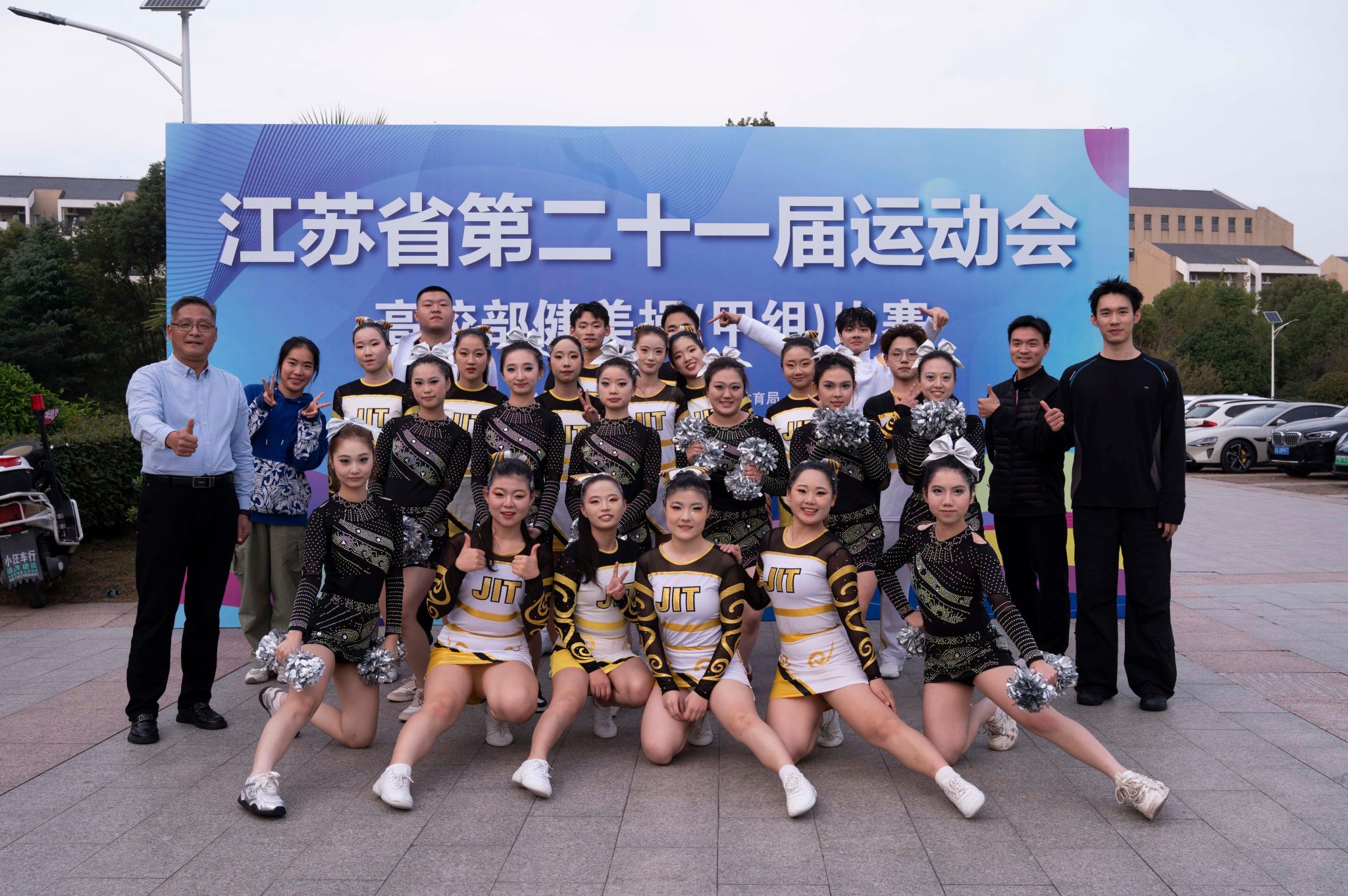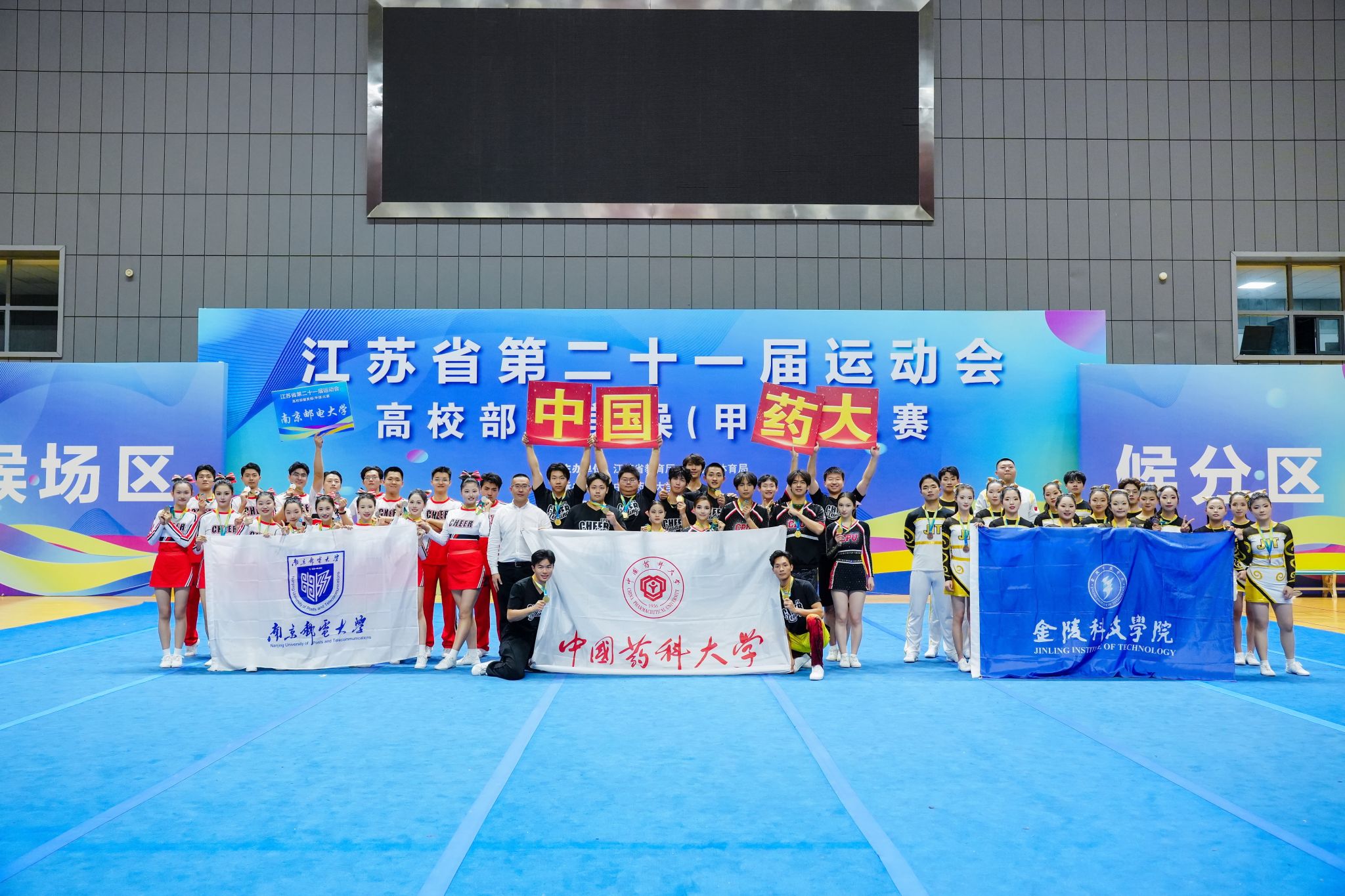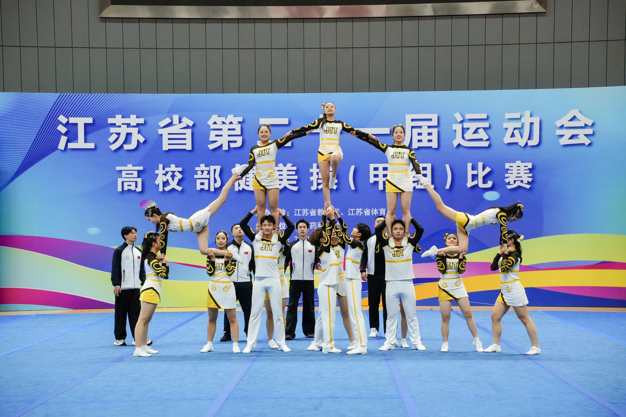 10月30日-11月2日,江苏省第二十一届运动会高校部健美操(甲组)角逐在南京市中国药科大学盛大举行。。。。。。。。我校派出了由商学院、人文学院、网通学院、外院、艺术学院、质料工程学院、国教院、软件学院、智控学院等10个学院共26学生组成的啦啦操队加入了此次角逐,并获得了甲B组花球啦啦操第十二名和技巧啦啦操第三名的好效果,,,,,,,这也是我校首次在省运会该项赛事中站上领奖台。。。。。。。。