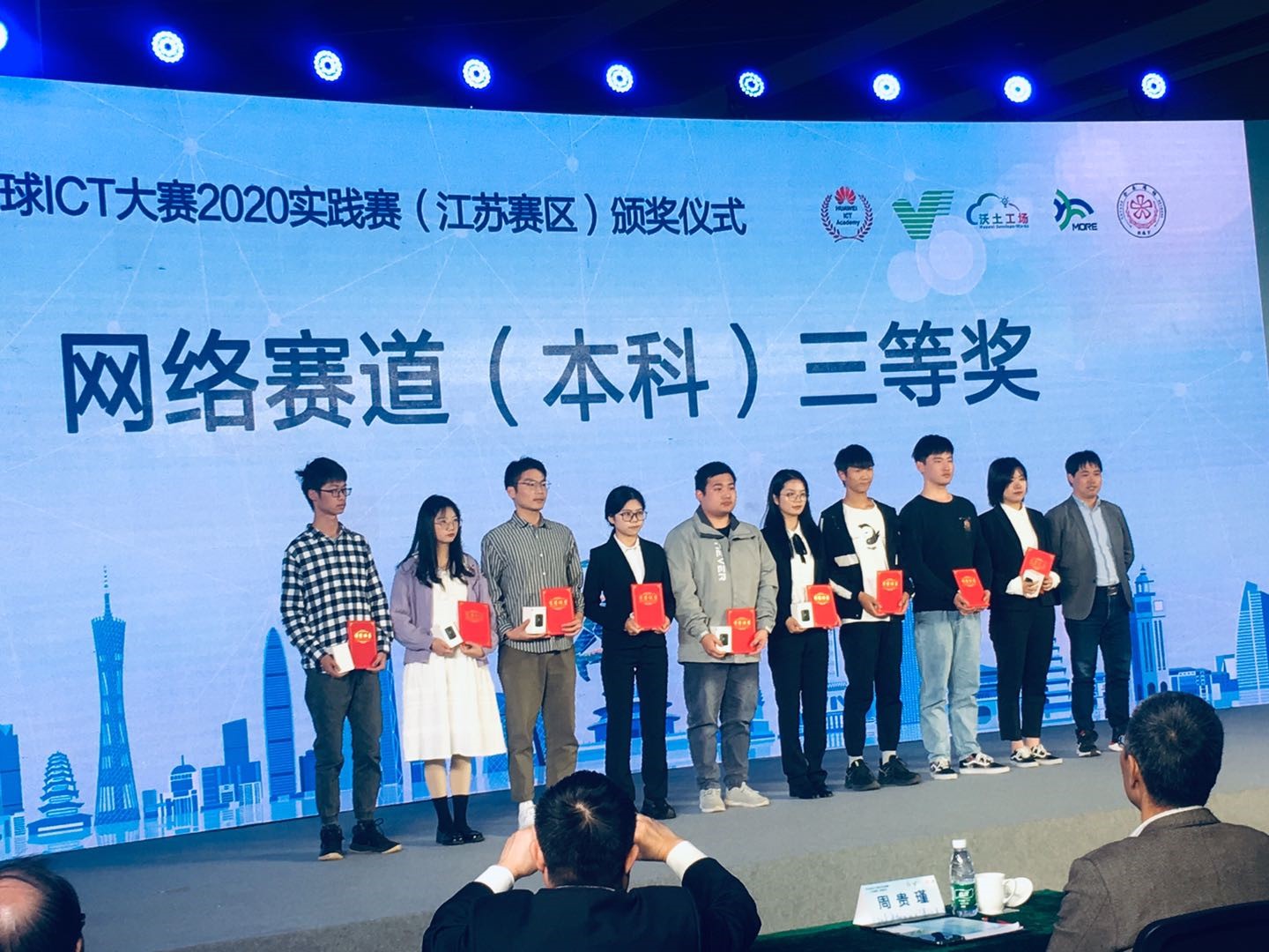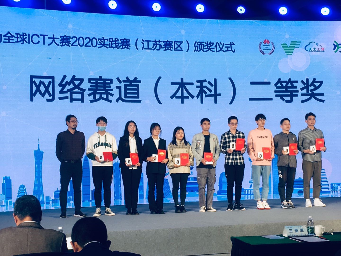 10月23日下昼,,,,,,,“华为ICT大赛”江苏赛区颁奖乐成举行,,,,,,,我校网通学院代表队以本科组网络赛道排名第二的整体效果乐成晋级,,,,,,,将代表东部赛区加入中国区晋级赛,,,,,,,与来自天下六大赛区的18支步队角逐全球决赛的席位。。。。。。