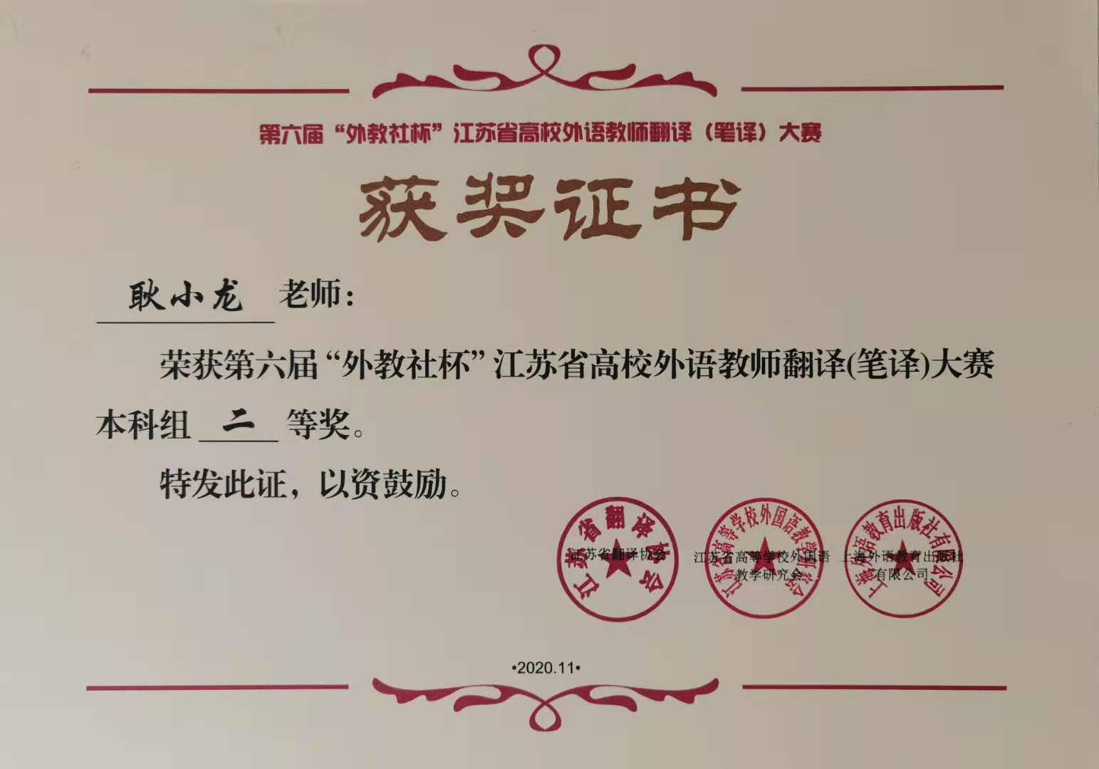 据悉,,,,,,,,“外教社杯”江苏省高校外语西席翻译(笔译)大赛旨在响应国家“一带一起”建议,,,,,,,,增进翻译学科建设与外国语言的昌盛与生长,,,,,,,,作育高素质的高校外语西席。。。。。。。。大赛为我校翻译(笔译)教学与研究及学科交流学习提供了一个优异的平台,,,,,,,,对推动翻译教学的生长有起劲增进作用。。。。。。。。