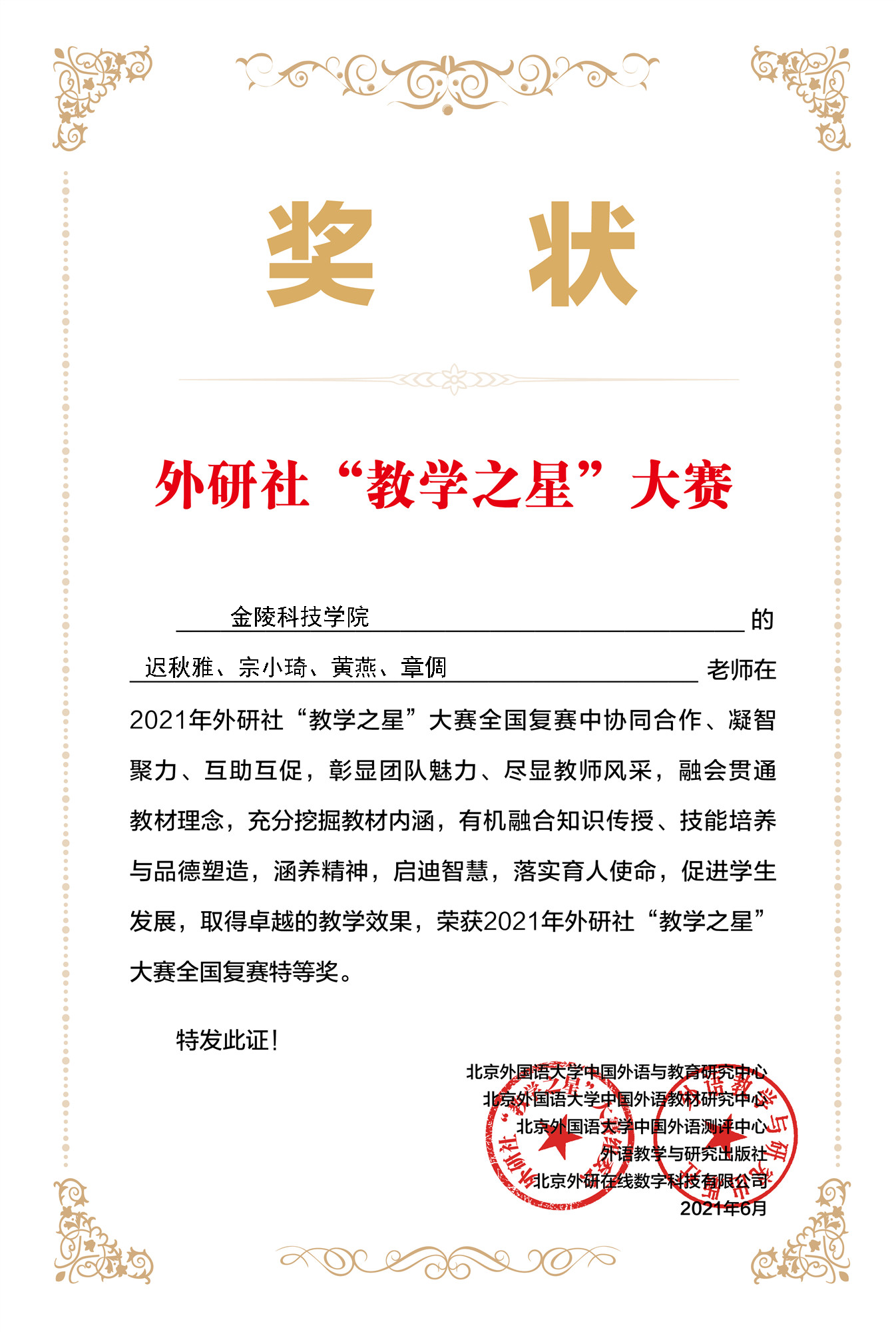 克日,,,,,,2021年外研社“教学之星”大赛天下复赛效果宣布,,,,,,外国语学院迟秋雅、宗小琦、黄燕、章倜西席团队荣获天下复赛特等奖,,,,,,晋级天下半决赛。。。。。