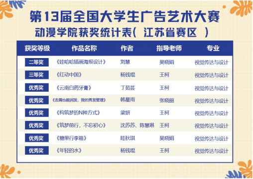 克日,,,,,,,第13届天下大学生广告艺术大赛江苏省赛效果宣布。。。。。。。动漫学院视觉转达与设计系学生获得二等奖、三等奖各一项,,,,,,,优异奖六项。。。。。。。