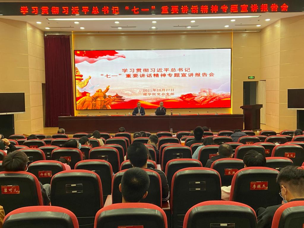 10月27日下昼,,,,,理学院举行学习贯彻习近平总书记“七一”主要讲话精神专题宣讲报告会暨中心组集中专题学习会。。。。。。。。市委宣讲团成员、马克思主义学院秦广东副教授作专题宣讲报告,,,,,理学院教工及2021级新生共计100余人聆听了报告。。。。。。。。报告由学院书记雍海龙主持。。。。。。。。