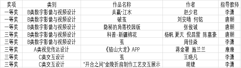 克日,,,,,,第九届天下高校数字艺术设计大赛(未来设计师NCDA大赛)获奖名单揭晓,,,,,,动漫学院数字媒体艺术专业学生在本次大赛中获得优异效果,,,,,,斩获B类数字影像与视频设计类一等奖三项、B类数字影像与视频设计类三等奖两项、C类交互设计三等奖两项、A类视觉转达设计三等奖一项,,,,,,李潇和唐朝两位西席获得“优异指导西席”奖。。。。。。。。