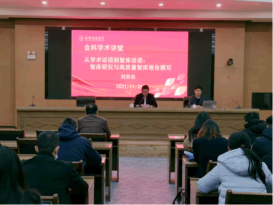 11月26日上午,,,,,,,,江苏省社科联研究室主任刘西忠应邀作题为《学术话语到智库话语:智库研究与高质量智库撰写》的学术报告,,,,,,,,2021年新入职西席、商学院、人文学院、动漫学院、外国语学院等相关学院西席加入了报告会。。。。。。。。报告会由科技随处长刘磊主持。。。。。。。。