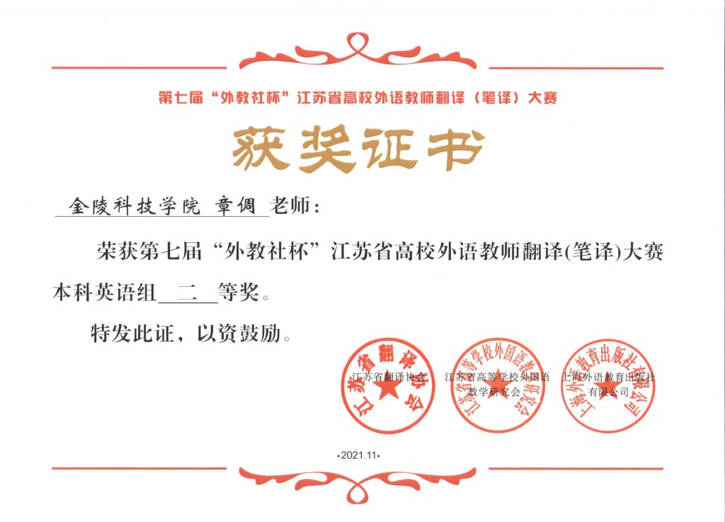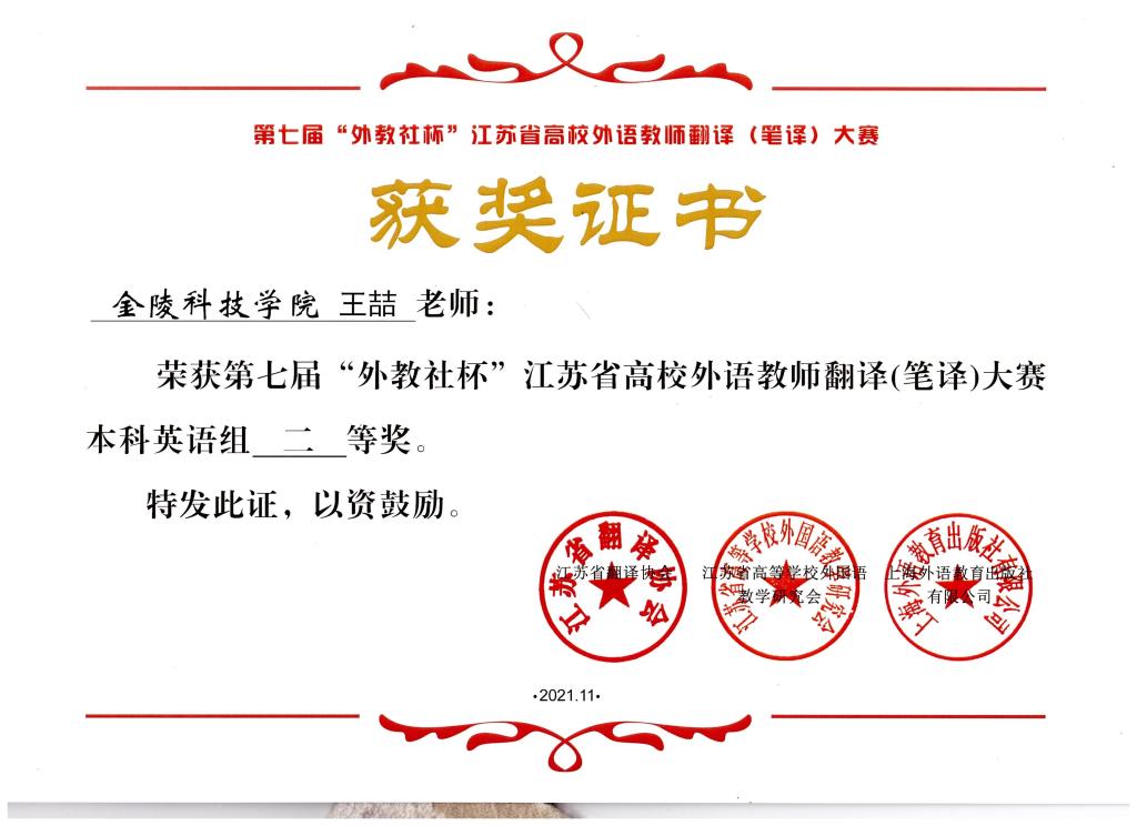 11月26日–27日,,,,,,第七届“外教社杯”江苏省高校外语西席翻译(笔译)大赛暨颁奖仪式线上乐成举行。。。。。。。我校外国语学院西席王喆、章倜喜获二等奖。。。。。。。