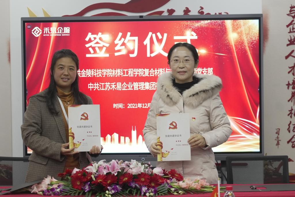 复合质料系西席党支部书记王昆彦、江苏禾易企业治理有限公司党支部书记陈蕾代表双方签署共建协议。。。。。。。双方确定了三个共建内容:一是增进互动,,,,,,,提高下层党组织建设质效;;;;;;;二是增强互通,,,,,,,增进双方事业高质量生长;;;;;;;三是优化资源,,,,,,,实现双方互赢新时势。。。。。。。