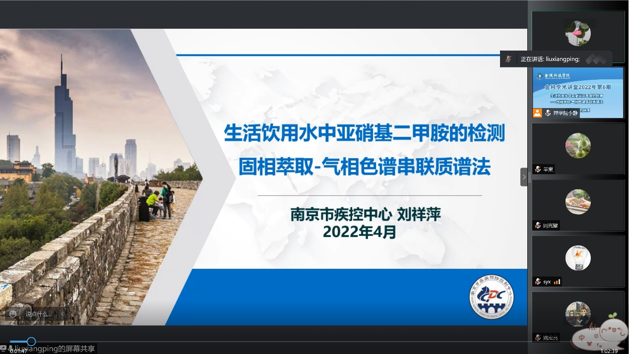4月28日下昼,,,,,,,,南京市疾病预防控制中心主任技师刘祥萍博士应邀为我校师生作题为《生涯饮用水中亚硝基二甲胺的检测——固相萃取-气相色谱串联质谱法》的线上学术讲座。。。。。讲座由理学院李静副教授主持,,,,,,,,理学院、动物科学与食物工程学院以及相关学院师生线上聆听。。。。。