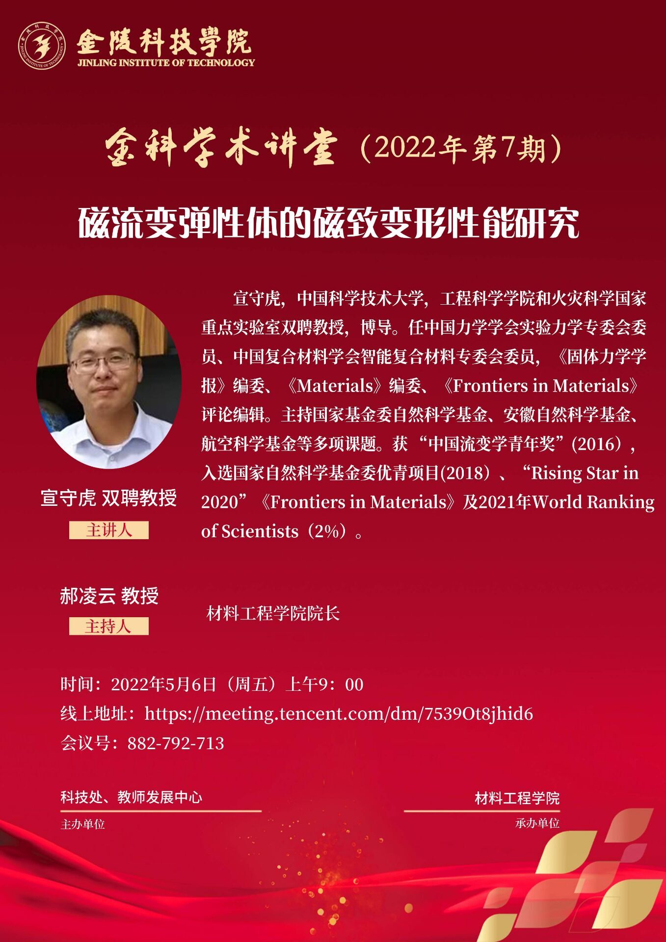 5月6日上午,,,,,中国科学手艺大学工程学院博士生导师宣守虎教授应邀为我校师生作题为《磁流变弹性体的磁致变形性能研究》的线上学术讲座。。。。。。。讲座由质料工程院长郝凌云教授主持,,,,,共计400余名师生聆听了讲座。。。。。。。