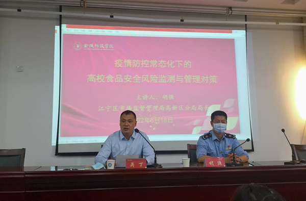 为切实做好疫情防控和食物清静双包管事情,,,,,,5月18日,,,,,,后勤实业总公司在金科宾馆组织召开“疫情防控常态化下的高校食物清静危害监测与治理对策”主题培训会,,,,,,江宁区疫情防控“五大员”之一、江宁区市场监视治理局高新区分局局长胡强应邀授课。。。。。。。后勤实业总公司副总司理吴丁主持培训会。。。。。。。