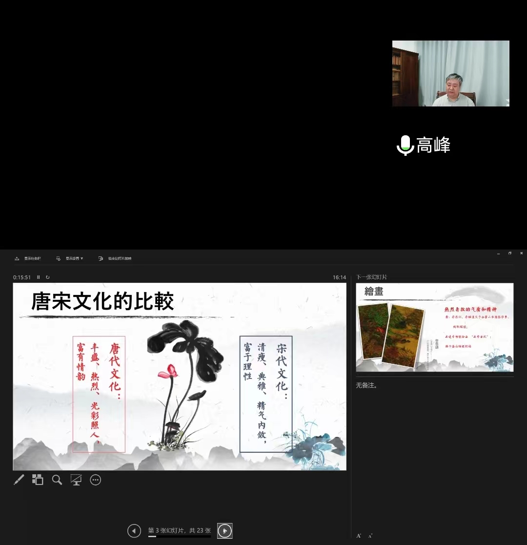 岑岭教授从文化学、美学等视角探析唐宋诗词风姿各异的审美意见意义和艺术魅力:唐代文化丰富、热烈、色泽照人;;;;;;宋代文化清瘦、高雅、精气内敛。。。。。他以为,,,,,,,唐宋文化的差别详细体现在种种文学艺术形态以及唐宋人差别的生涯方法、精神情质等方面,,,,,,,展现了中国文化的广博精湛以及差别历史时期的差别风貌。。。。。讲座尾声,,,,,,,岑岭教授用专业优美地吟诵唐宋诗词,,,,,,,把气氛推向热潮。。。。。