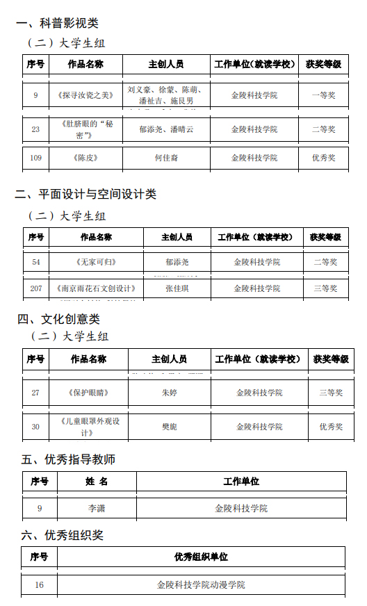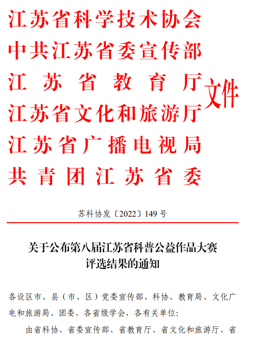 克日,,,,,,由省科协、省委宣传部、省教育厅、省文化和旅游厅、省广播电视局、团省委团结举行的第八届江苏省科普公益作品大赛效果宣布。。。。。。。。动漫学院数字媒体艺术专业和动画专业组织作品40余项参赛,,,,,,共获得一等奖1项,,,,,,二等奖2项,,,,,,三等奖2项,,,,,,优异奖2项,,,,,,优异指导西席奖1项。。。。。。。。动漫学院获优异组织奖。。。。。。。。
