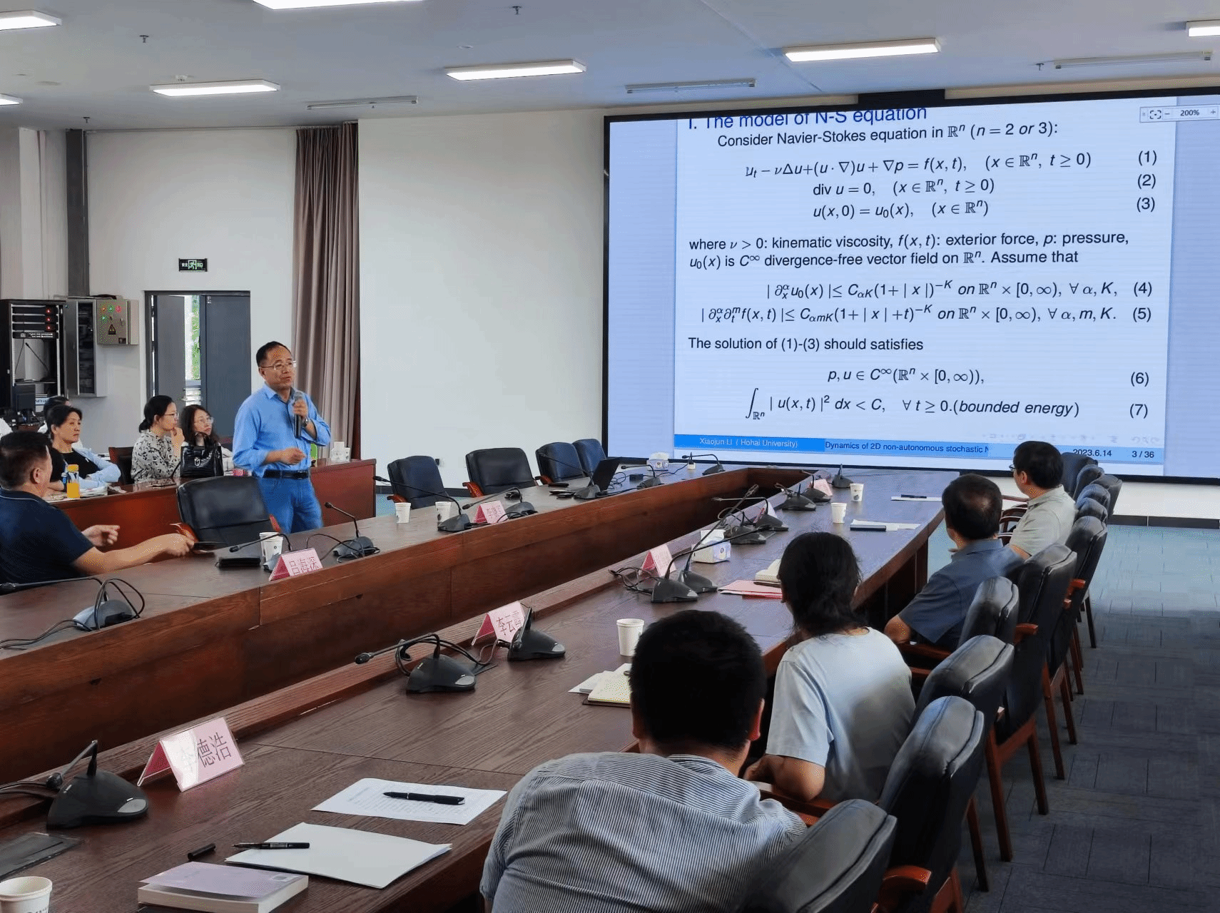 6月14日,,,,,,,,河海大学博士生导师李晓军、吕海深教授应理学院约请来我校划分作题为《由线性噪声驱动的二维非自治随机Navier-Stokes方程的动力学》和《遥感水文及其应用》的学术报告,,,,,,,,并就基金申报等方面与参会西席举行了座谈。。。。。。。理学院数学系和数学教研室西席及部分学生聆听了报告。。。。。。。本次报告由理学院院长张国印教授主持。。。。。。。