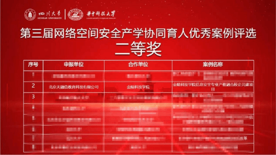 克日,,,,,由教育部高等学校网络空间清静专业教学指导委员会产学相助育人事情组主理、四川大学与华中科技大学配合承办的“第三届网络空间清静产学协同育人优异案例”评选运动正式宣布获奖名单。。。。。网络清静学院与北京天融信教育科技有限公司(下文简称天融信教育)相助的《看个球app官网信息清静专业产教融合校企共建项目》获评优异案例二等奖。。。。。