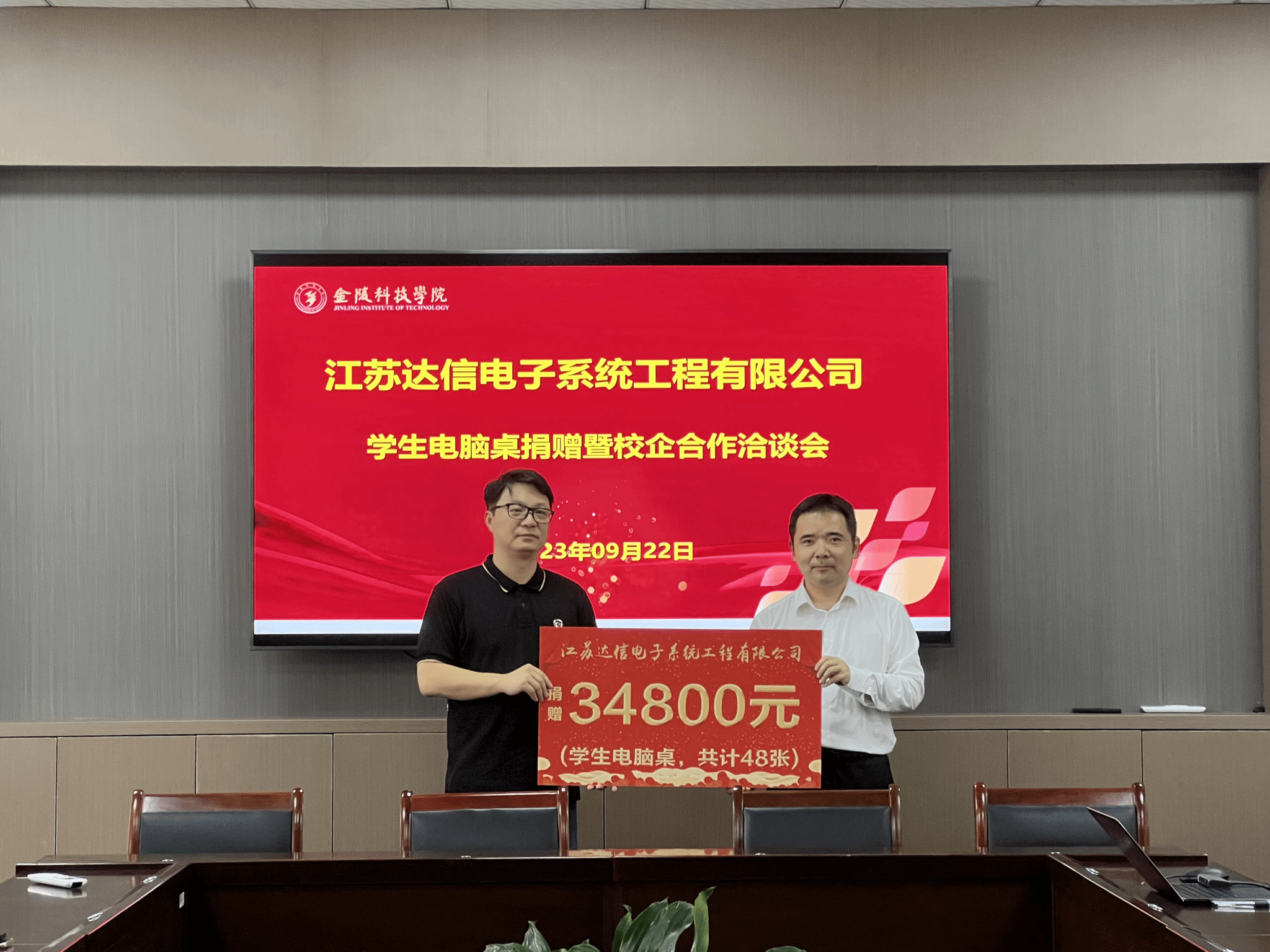 江苏达信为我院学子捐赠电脑桌共计48张,,,,,,,,价值34800元。。。。。。。。这次捐赠运动为学生营造优异教育情形,,,,,,,,助推我校南京化战略高质量生长。。。。。。。。王贤波体现,,,,,,,,希望可以与江苏达信增强产学研相助,,,,,,,,深化协作育人,,,,,,,,提升人才作育质量,,,,,,,,实现共赢时势。。。。。。。。