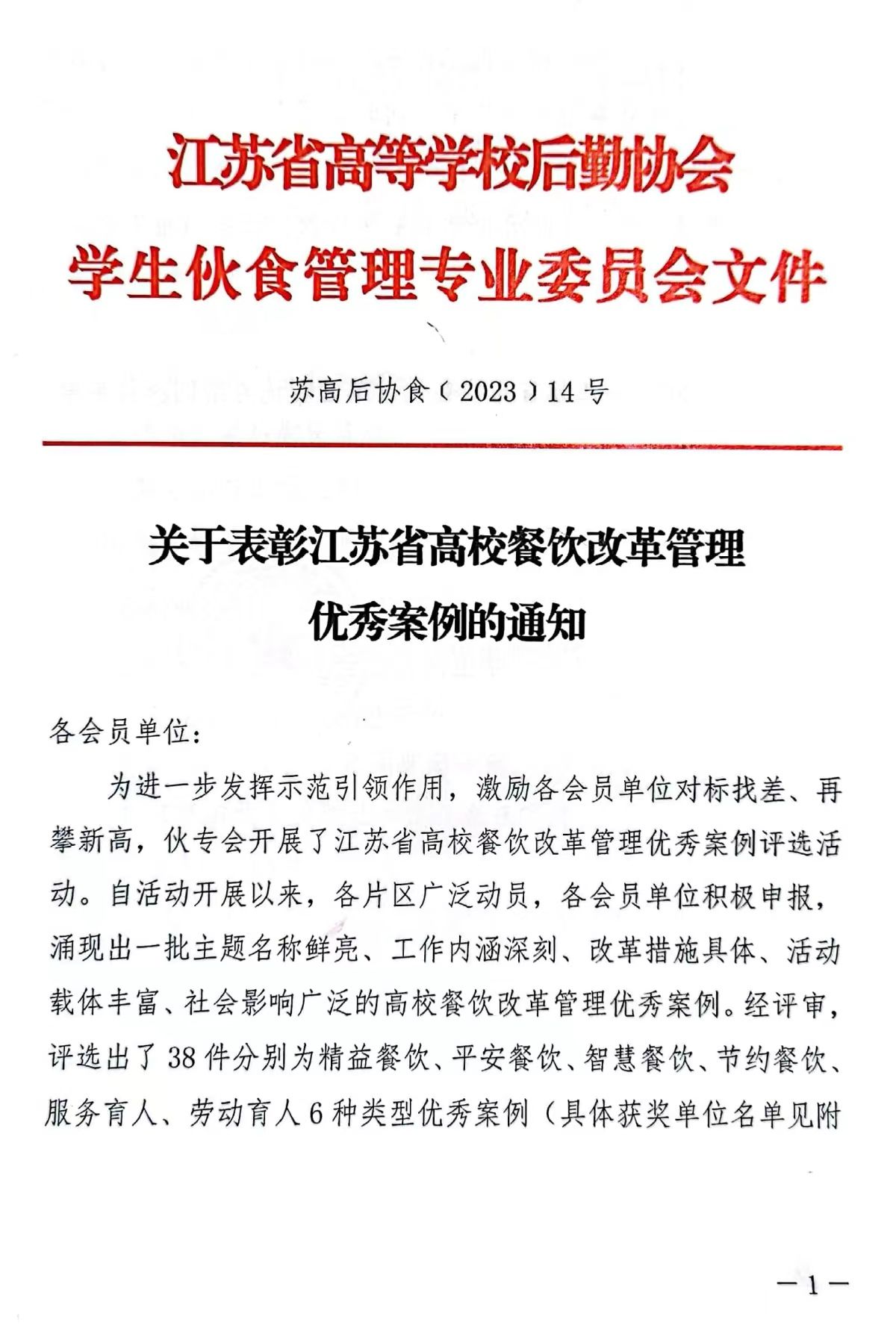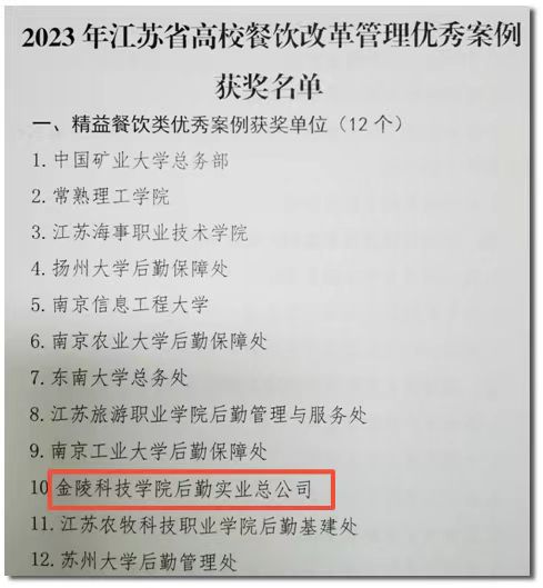 克日,,,,,,,江苏省高等学校后勤协会学生伙食治理专业委员会开展了“江苏省高校餐饮刷新治理优异案例”评选运动,,,,,,,我校后勤实业总公司餐饮刷新治理案例被评为精益餐饮类优异案例。。。。。