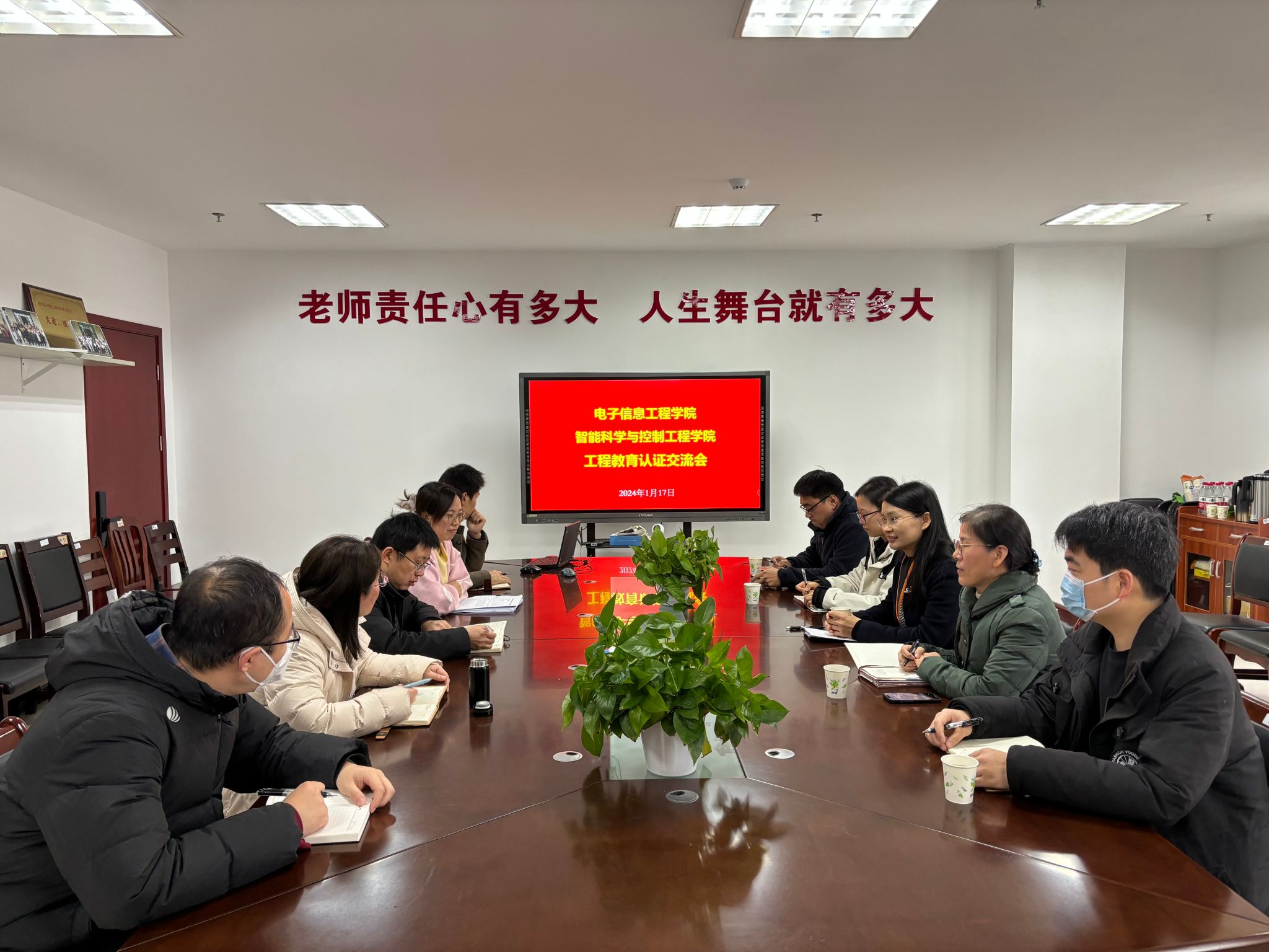 1月17日,,,,,,,电子信息工程学院与智能科学与控制工程学院在科技楼4-410聚会室团结召开“工程教育专业认证”专题交流会。。。。。电子信息工程学院院长胡国兵、副院长杨娟,,,,,,,智能科学与控制工程学院院长高素美、副院长徐楠,,,,,,,电子信息工程系和物联网工程系主任及西席代表加入聚会。。。。。