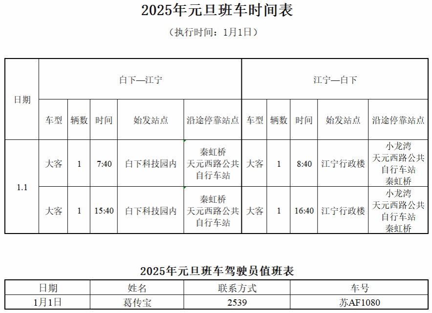 凭证2025年元旦放假安排,,,,,,,,现将2025年元旦班车时间安排(1月1日)宣布如下: