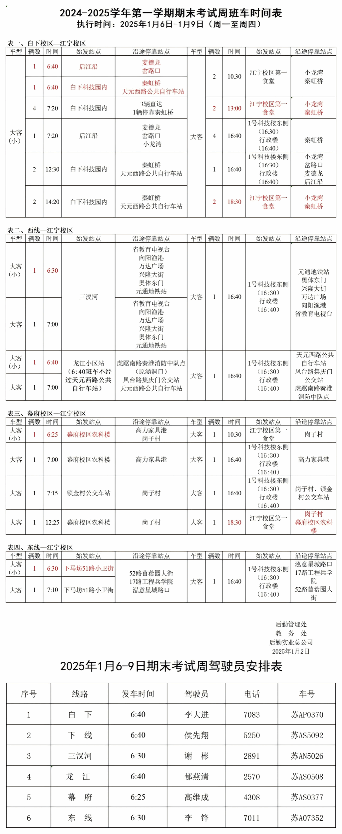 凭证学校事情安排,,,,,,现将2024-2025学年第一学瓢②末考试周班车时间安排(1月6日-1月9日)宣布如下: