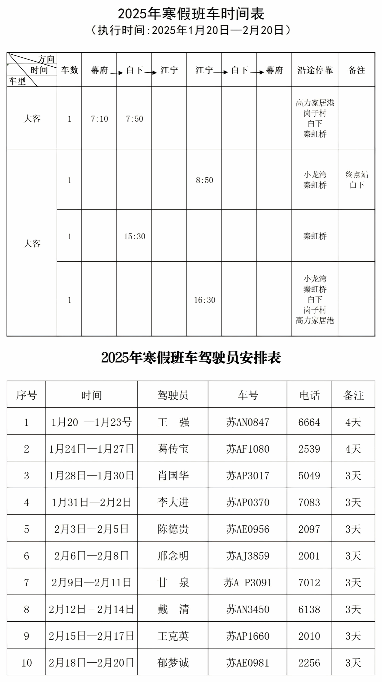 凭证学校事情安排,,,,,,现将2025年寒假班车时间安排宣布如下: