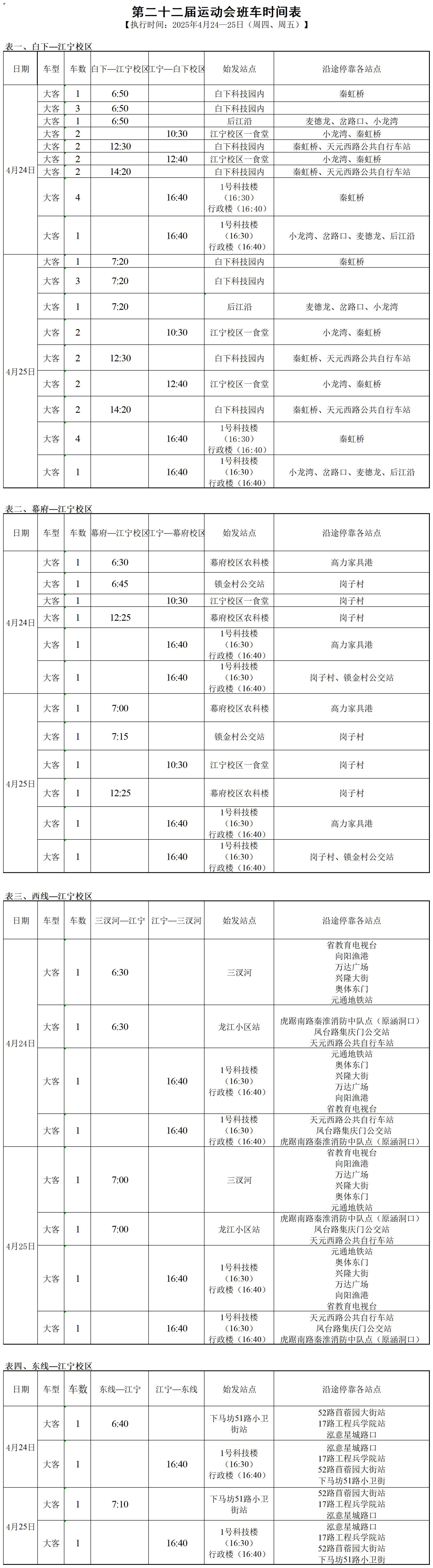 凭证学校事情安排,,,,,,,,现将第二十二届运动会班车时间安排宣布如下:
