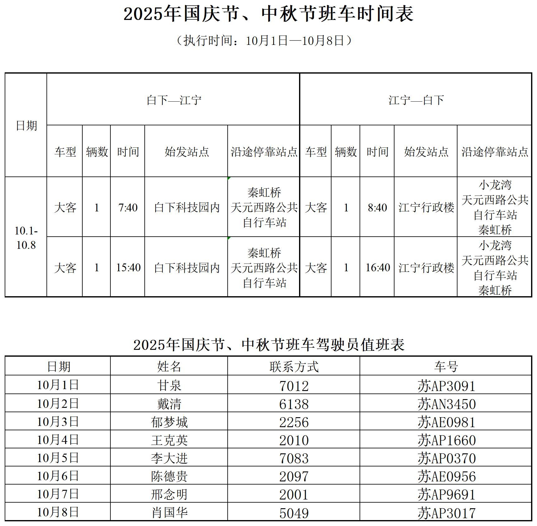 凭证2025年国庆节、中秋节放假安排,,,,,现将2025年国庆节、中秋节班车时间安排宣布如下: