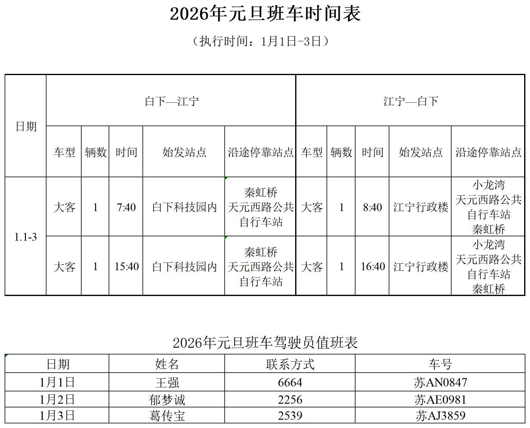 凭证2026年元旦放假安排,,,,,,,,现将2026年元旦班车时间安排(1月1日-3日)宣布如下: