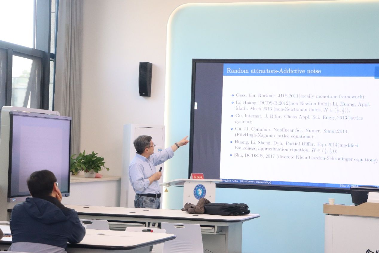 高洪俊教授先容了粗糙路径的基本看法以及粗糙微分方程动力学的研究希望,,,,,给出了最新关于线性乘性噪声驱动的随机微分方程的吸引子的保存性和同步化的效果。。。。。。其解说深入浅出,,,,,引起了在场师生浓重的兴趣。。。。。。针对先生们的提问,,,,,高洪俊用直观的语言给予了逐一解答。。。。。。