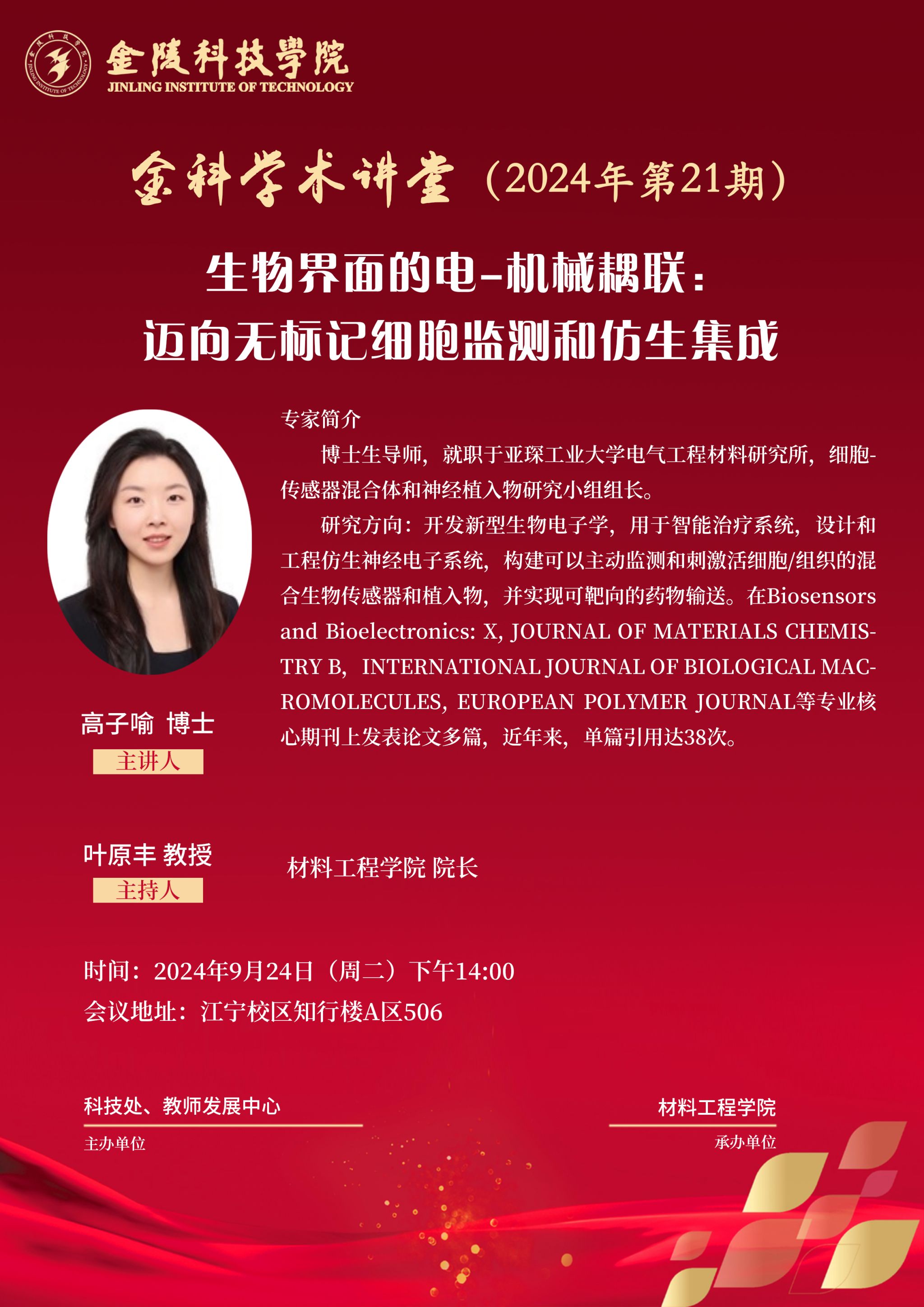 关于举行线下“金科学术课堂——生物界面的电-机械耦联:迈向无标记细胞监测和仿生集成”学术报告的通知